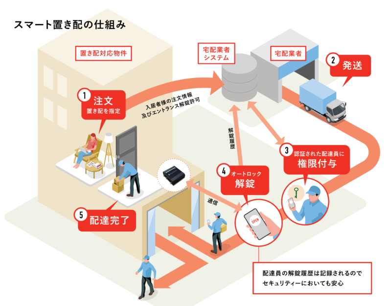 スマートロック「NinjaEntrance(ニンジャエントランス)」を用いて、オートロック付きマンションの共用エントランスの鍵をデジタル化することで、入館権限を付与された配達員がオートロックを解錠できるようになり、受取側があらかじめ指定した場所への配達が可能となるサービスです。解錠履歴は全て記録されるため、セキュリティ面でも安心してご利用いただけるほか、マンション管理会社様・オーナー様・管理組合様の費用負担なく導入が可能です。