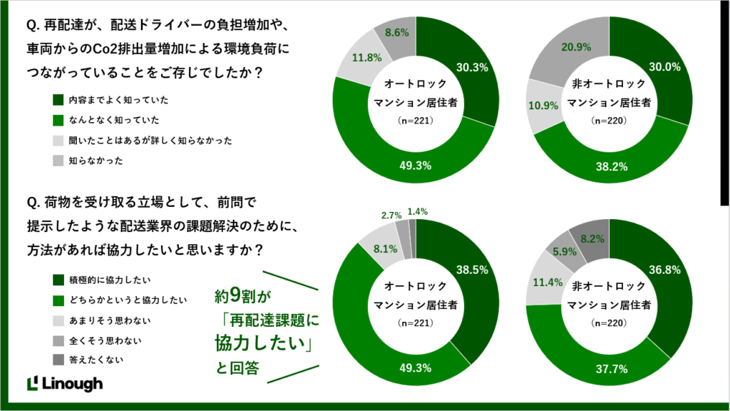 今回の調査により、多くのマンション居住者が再配達を「ドライバーの負担増加」や「環境負荷」といった深刻な社会課題として認識しており、解決に向けた高い協力意向を持っていることが浮き彫りとなりました。