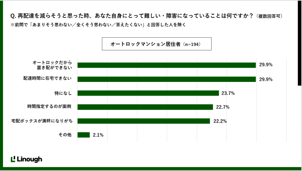 配送業界の課題解決に協力意向を持つオートロックマンションの居住者に、再配達を減らすための障害を調査した結果、「オートロックがあるため置き配ができない」と「配達時間に在宅できない」が最も多い回答となりました。また、「その他」を選択した回答者からは「配達時間の枠が少ない」という意見も寄せられました。