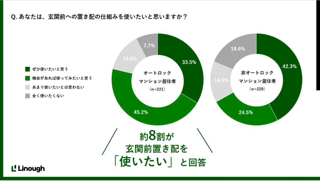 オートロックマンションでは約8割が「玄関前置き配」を使いたいと回答し、非オートロックマンション居住者の置き配利用意向を上回る傾向が見られました。