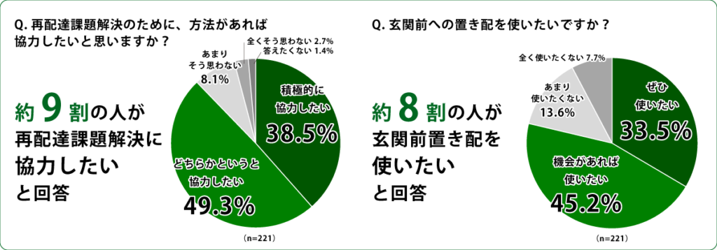 一方で、オートロック付きマンションの居住者を対象とした意識調査(※4)では、再配達という社会課題の解決に対して協力意向を持つ人が約9割にのぼり、約8割が「玄関前への置き配を使いたい」と回答しました。
