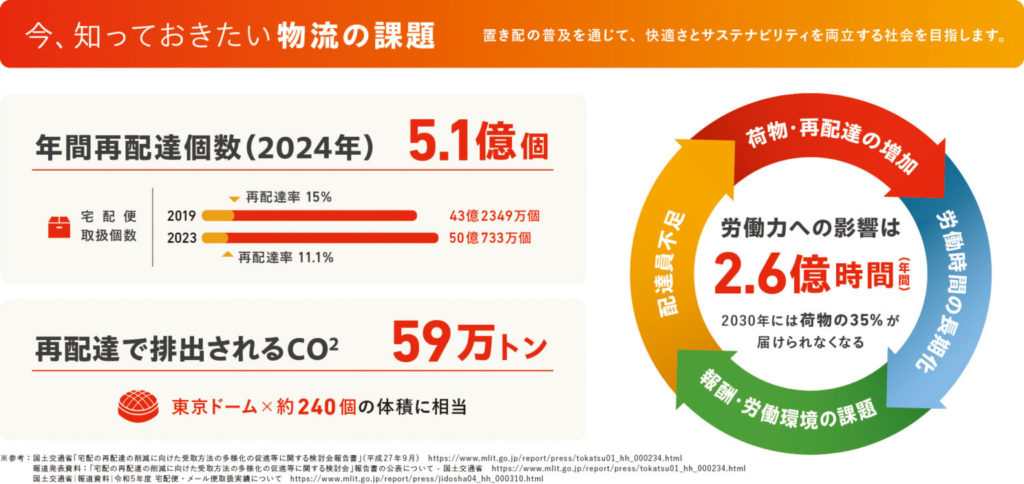 昨今、再配達による配達員の労働負担や物流コストの増加、CO₂排出による環境への悪影響が深刻な課題として注目されています。